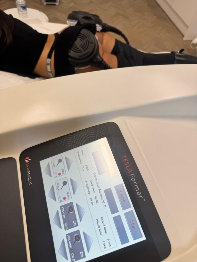 TESLAFormer is a non invasive device that uses Functional Magnetic Stimulation (FMS) to trigger deep muscle contractions, helping to strengthen, tone, and sculpt the body more effectively than regular exercise.